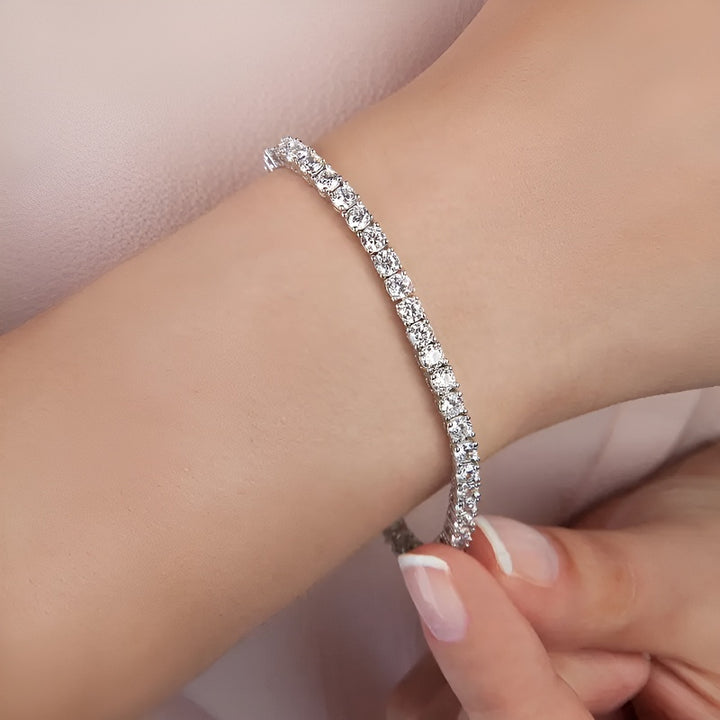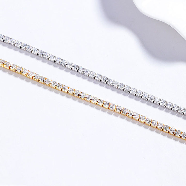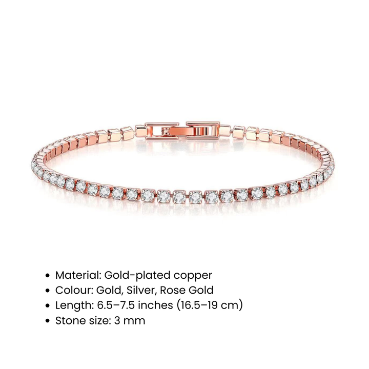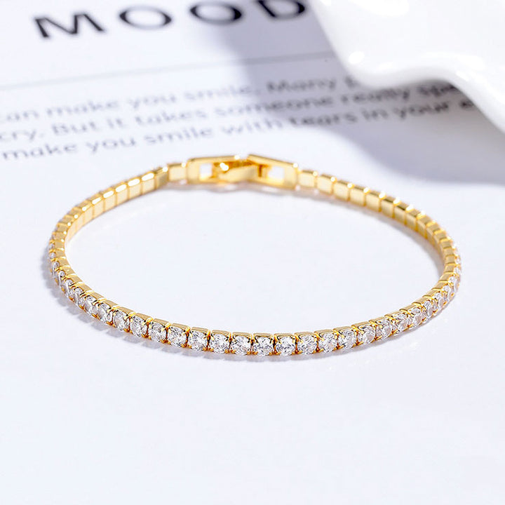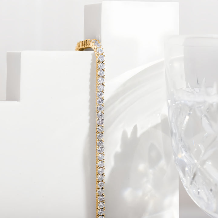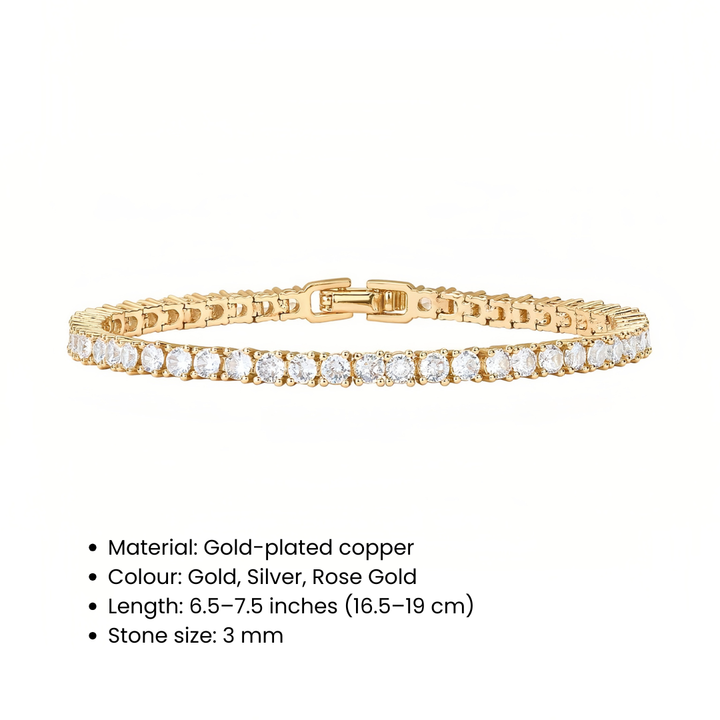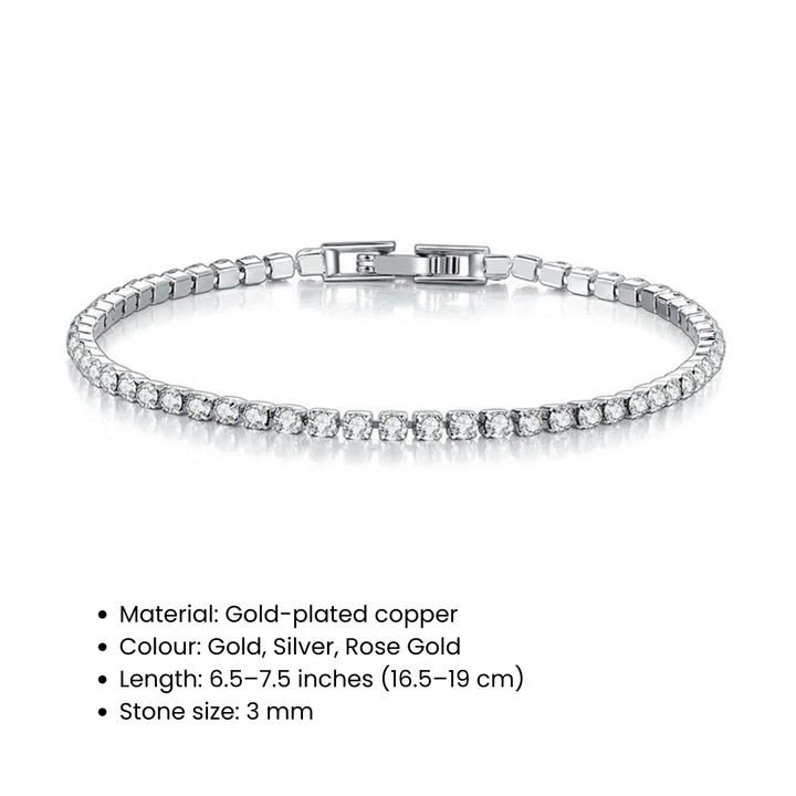 This 14k gold plated tennis bracelet is a must-have staple for any jewelry collection. Wear it alone for subtle sophistication or stack it with your favorite pieces for a bold, layered look.