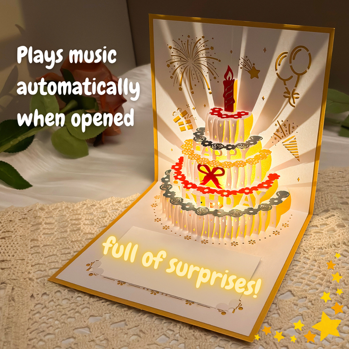 Open it to discover a stunning birthday cake that lights up and plays cheerful birthday music on its own — a delightful surprise for anyone you love.