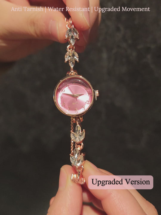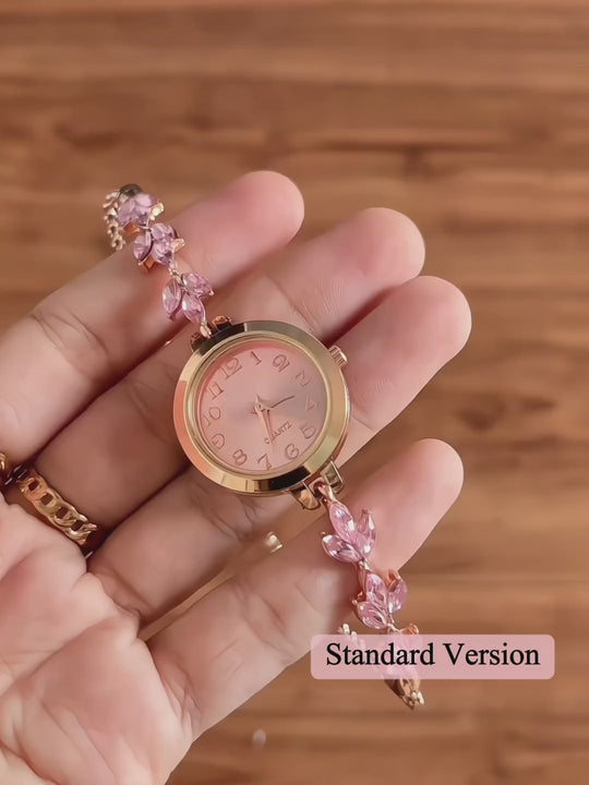 This refined women’s quartz bracelet watch, adorned with leaf-shaped crystals, transforms your wrist into an exquisite piece of jewelry.