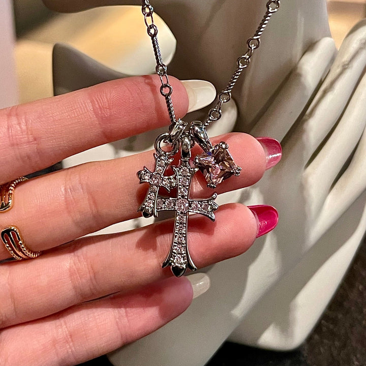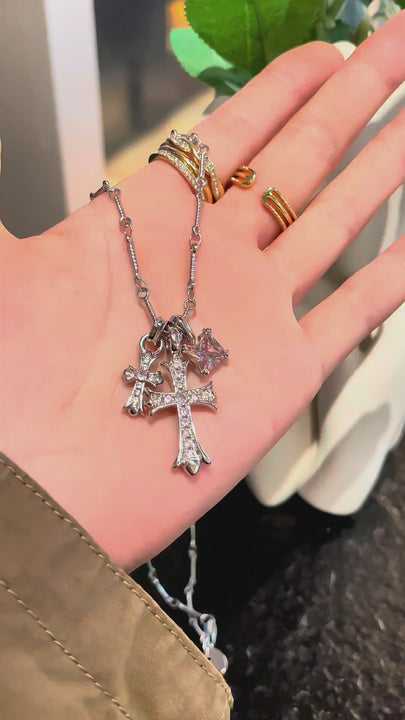 The unique design features double cross charms paired with a square-cut stone, creating a bold yet feminine statement piece that stands out.