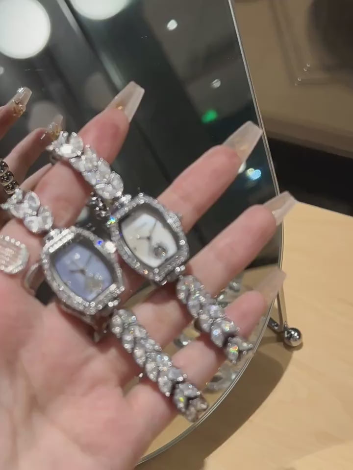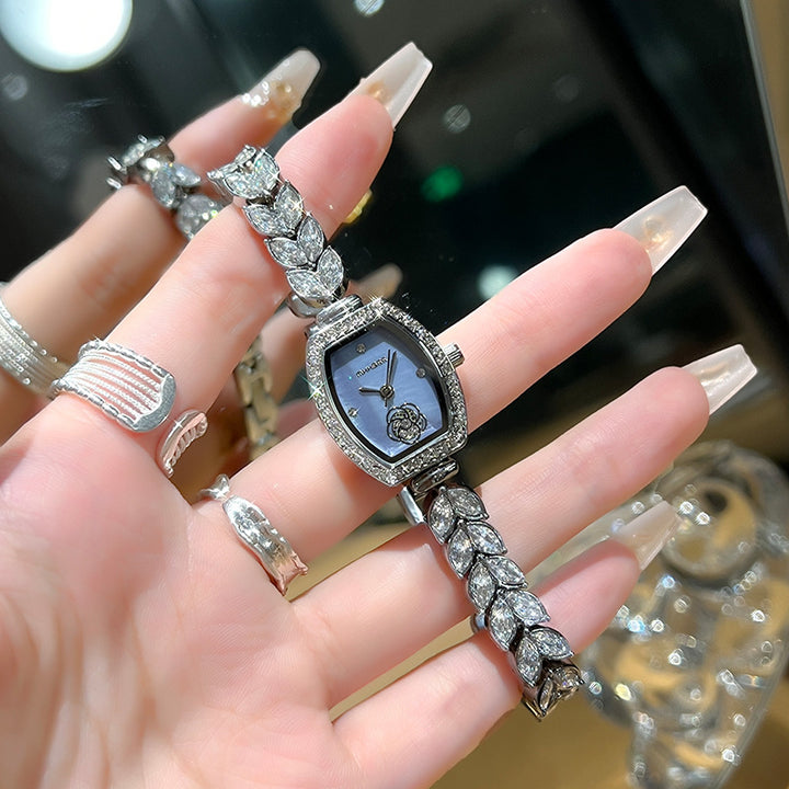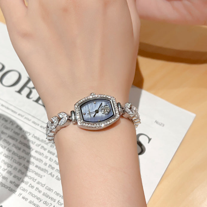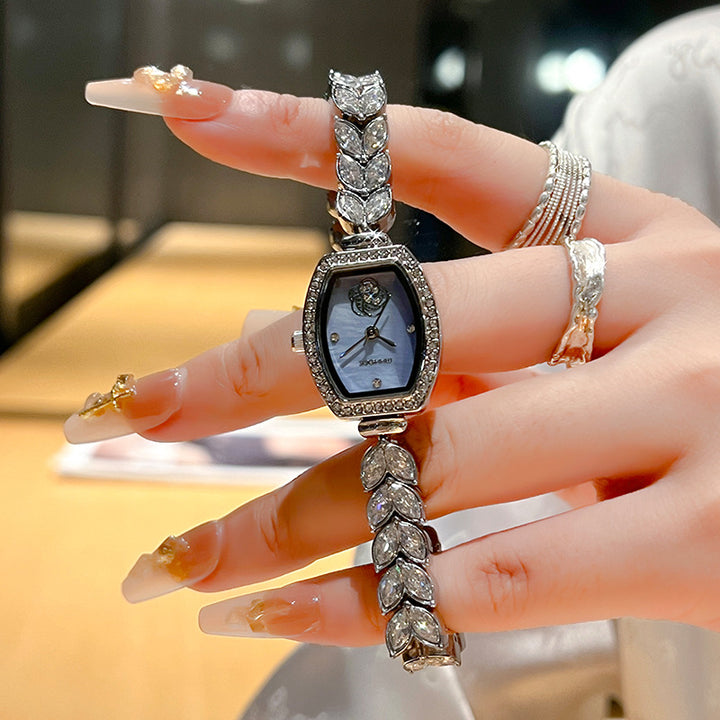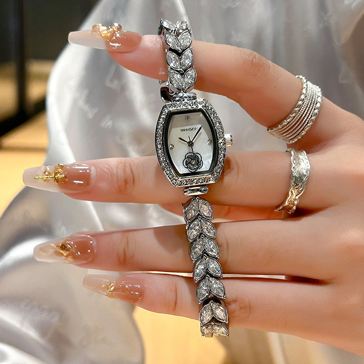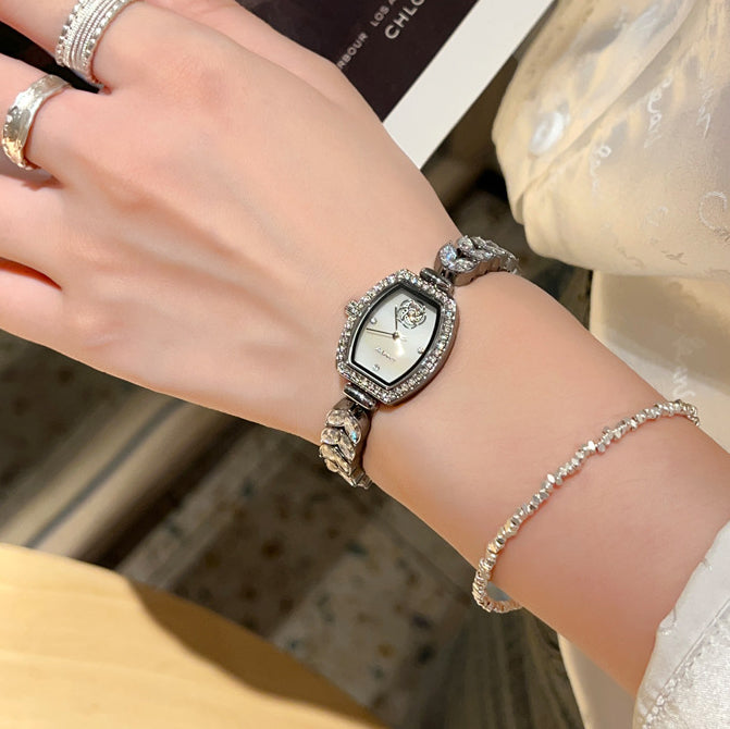 A watch that radiates elegance and charm. The bracelet shimmers like a mermaid’s tail, while the barrel-shaped dial is adorned with delicate camellia crystals, creating a graceful and feminine look. Perfect for adding a touch of sparkle to everyday wear or special occasions.