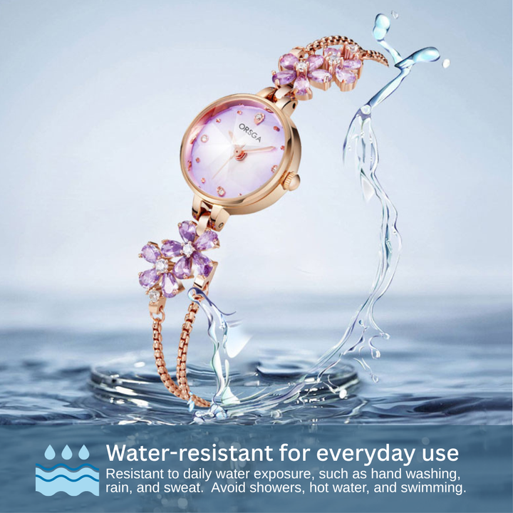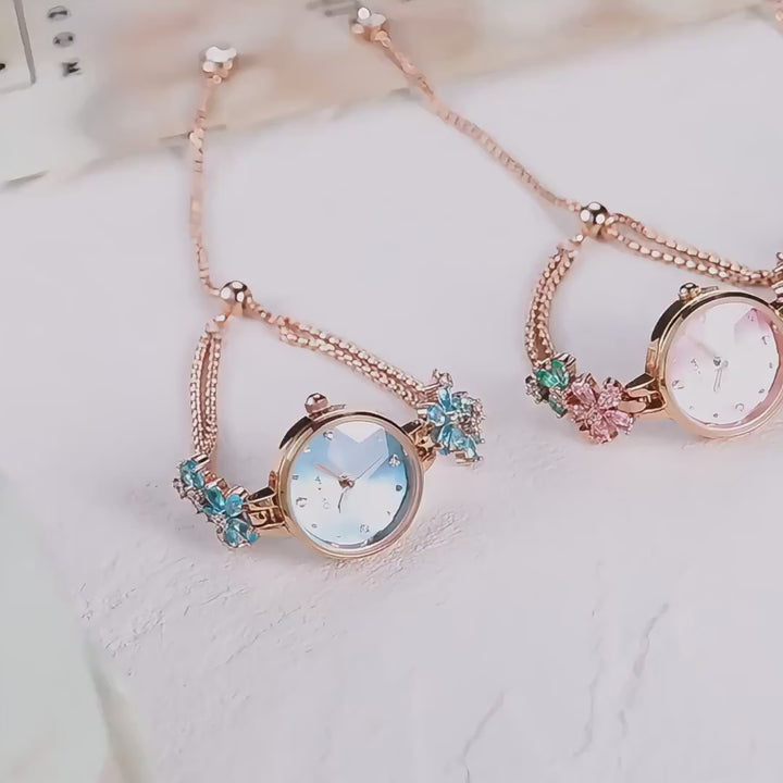 This elegant watch features a soft gradient dial that fades beautifully from light to dark, paired with a bracelet adorned with sparkling crystal floral accents.