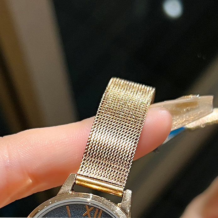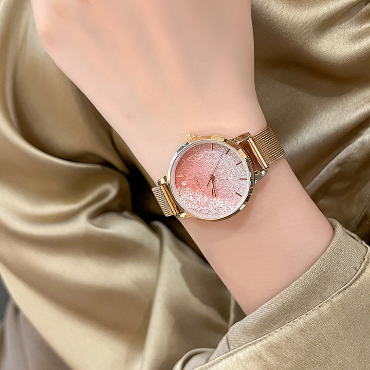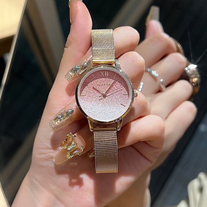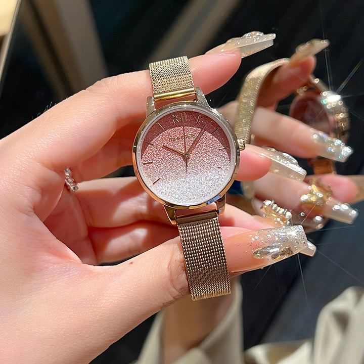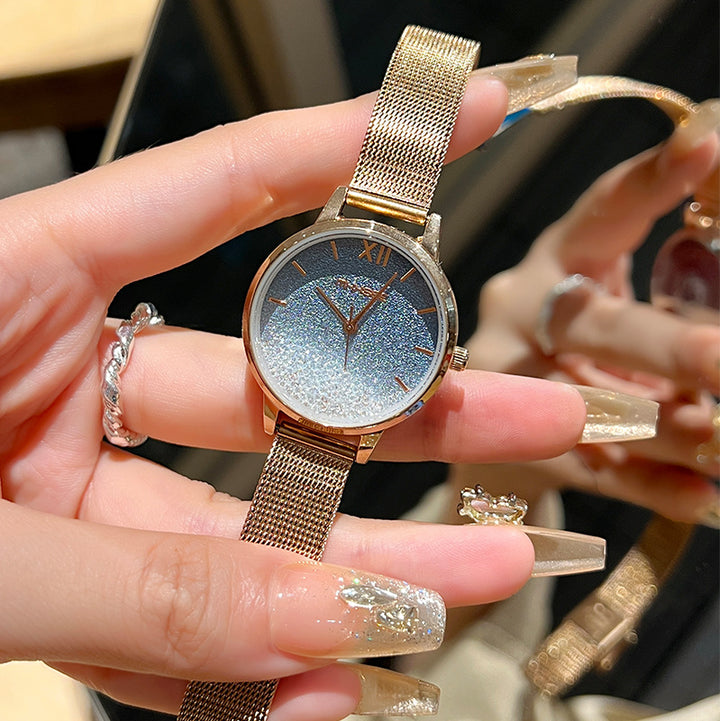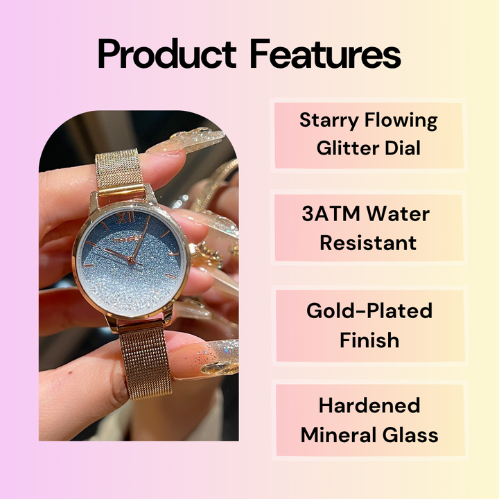 A dreamy watch that captures the beauty of the night sky. The hazy gradient dial sparkles like countless stars, creating a mesmerizing galaxy effect. Paired with a delicate mesh bracelet for a touch of elegance, it’s perfect for both everyday wear and special occasions.